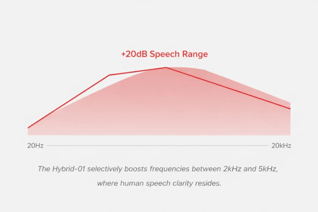 在复杂的环境噪声中,人声的清晰度往往取决于 2kHz 至 5kHz 这一关键频段。这是人类语言中辅音(如“s”、“t”、“k”)的核心所在,也是识别语义的关键。KŪ 的专利算法不仅在全频段提供 -45dB 的深度降噪,更针对这一“核心频段”提供了最高达 +20dB 的实时增益补偿。